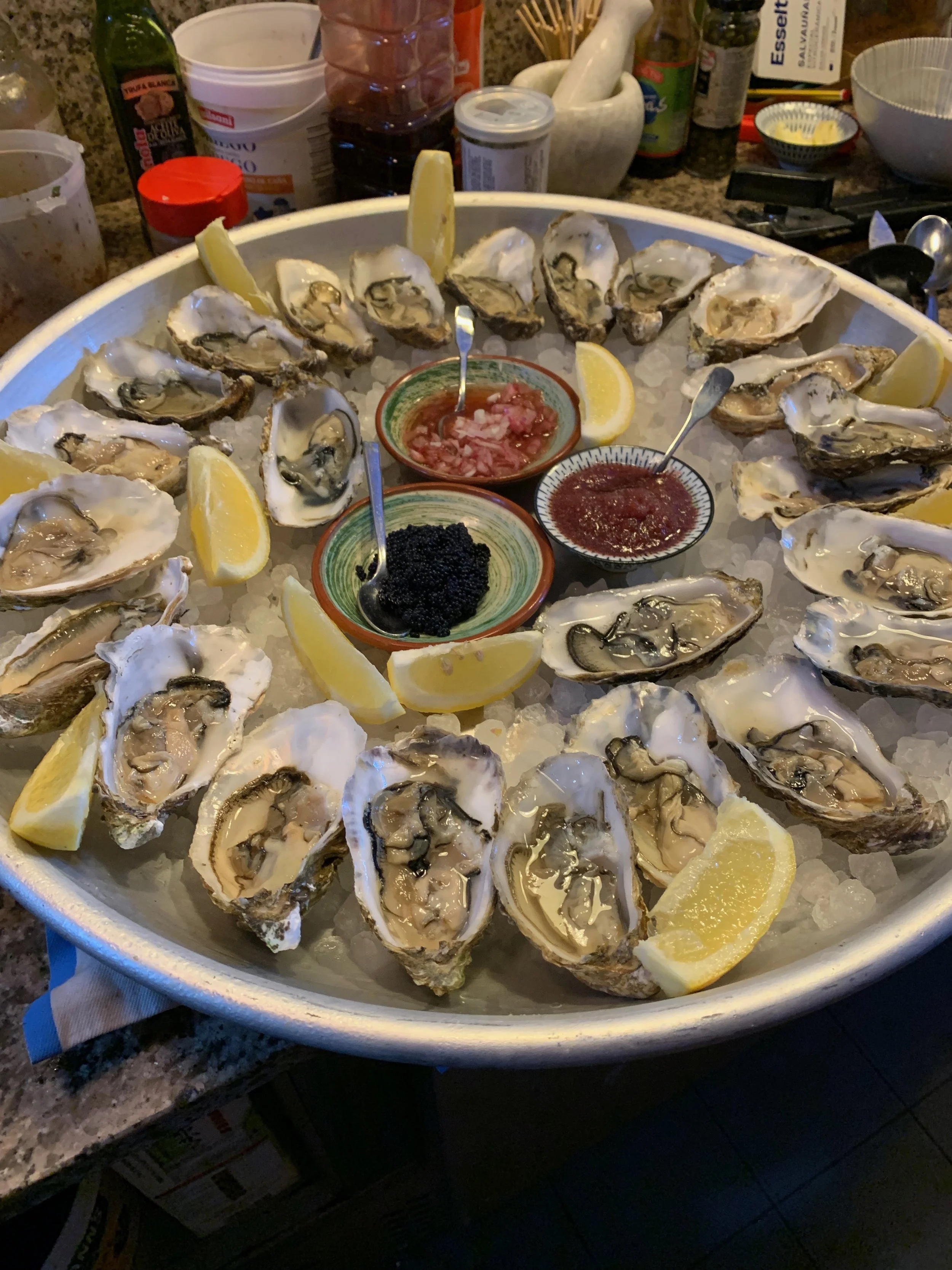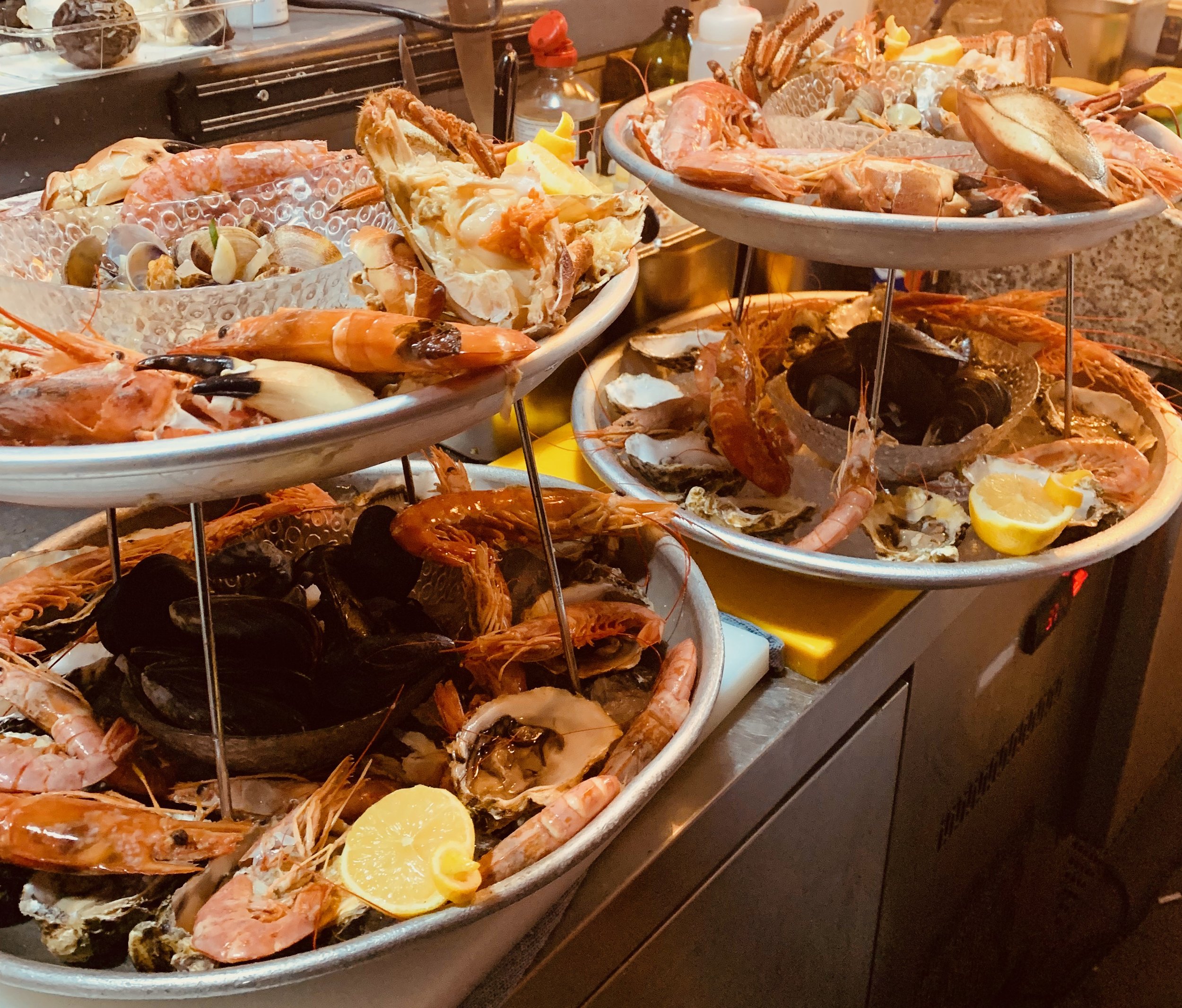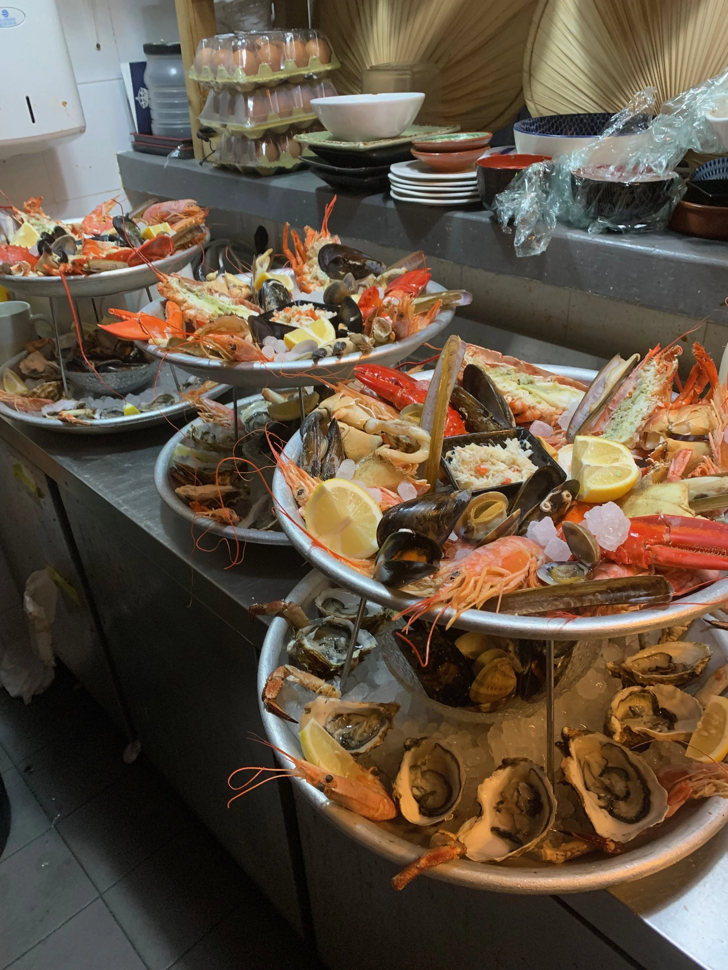 Shellfish platters are served chilled over ice … as you would expect to find in French seaside towns .. fruits de mer.