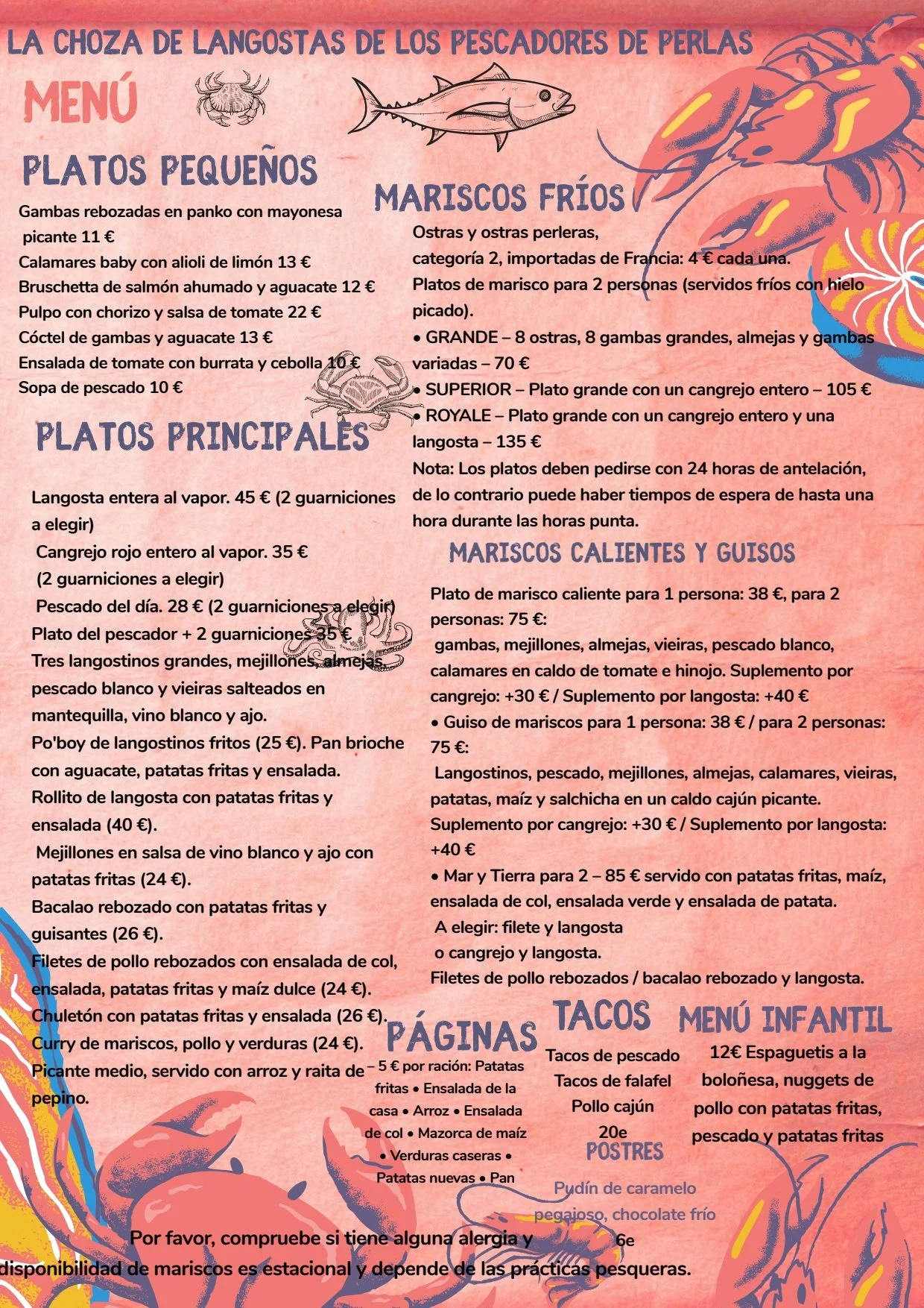 BOTTOMLESS BRUNCH we now do a bottomless brunch for 40 euros per head to include bottomless cava, Bloody Mary or sangria.. choose between one main per person or 2 small plates per person..or pay a 20 euro supplement and get a lobster dish or shellfish platters hot or cold to feast on.. this offer is between 11am and 2 pm daily and has to be prebooked and last 90 minutes