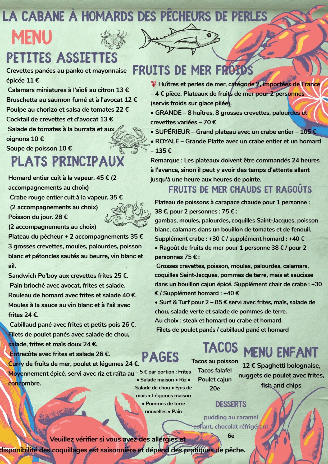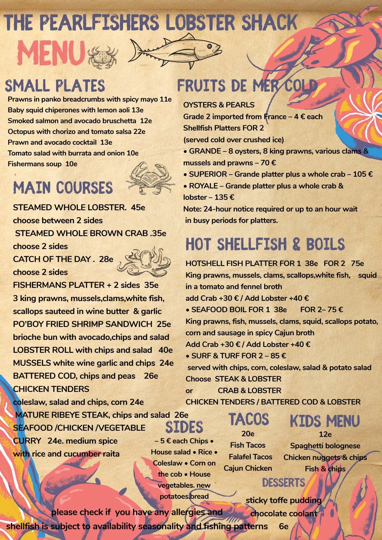 We specialise in serving fresh shellfish cooked and served on the day … for this we require 24 hours notice on shellfish bookings .. many places claim it’s fresh but it’s often frozen or left over from the day before .. we guarantee it’s fresh and cooked on the day